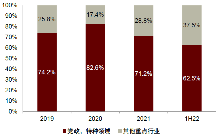 规模和商业模式回顾:政府端国产化自上而下推进,过去三年主要覆盖省市级政府办公系统。2020-2022年第一阶段的基础软硬件国产化替代在政府领域的内部办公相关系统中先行落地,政府端国产化推进节奏较为一致,通常以台套的模式为主,采用软硬件绑定的方式,一般在招投标环节有总集成商参与统筹。