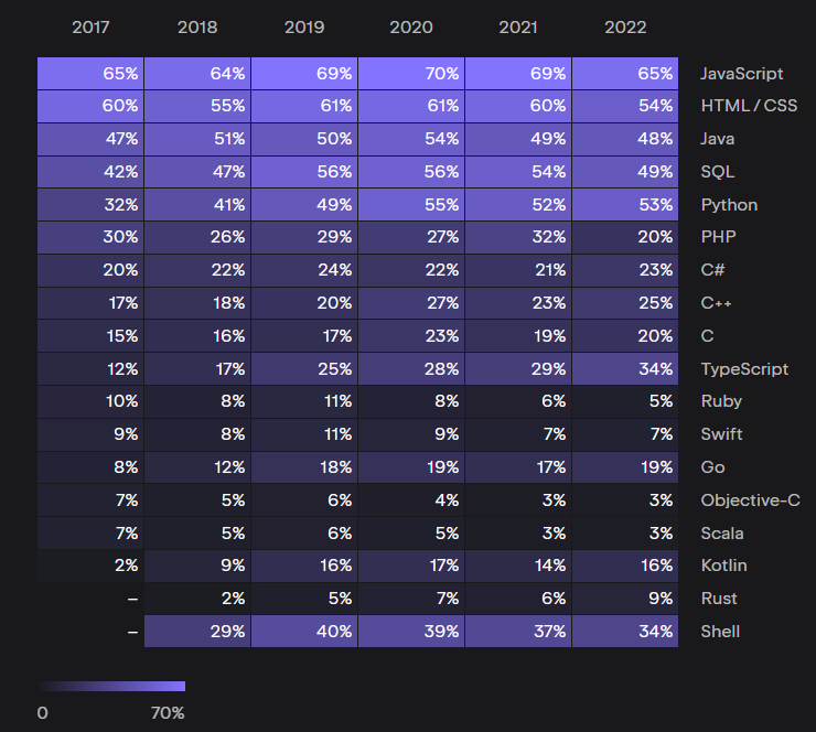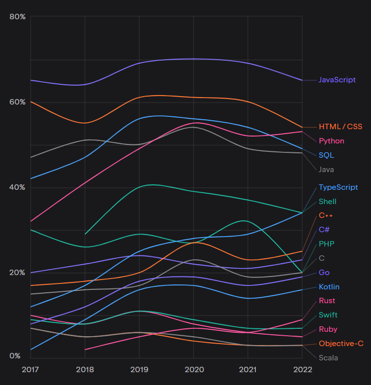 JavaScript 仍然是最流行的编程语言,尚未被 TypeScript 超越。TypeScript 的使用率在过去 6 年中几乎翻了三倍,从 2017 年的 12% 增加到 2022 年的 34%。