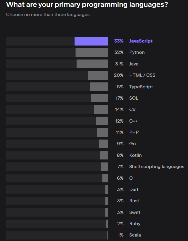 最受欢迎的五种编程语言是分别 Python、Java、JavaScript、C# 和 Kotlin,但是当考虑到这些偏好相对于使用这些语言的人数时,领先者则是 Kotlin、C#、Python、Rust 和 Java。