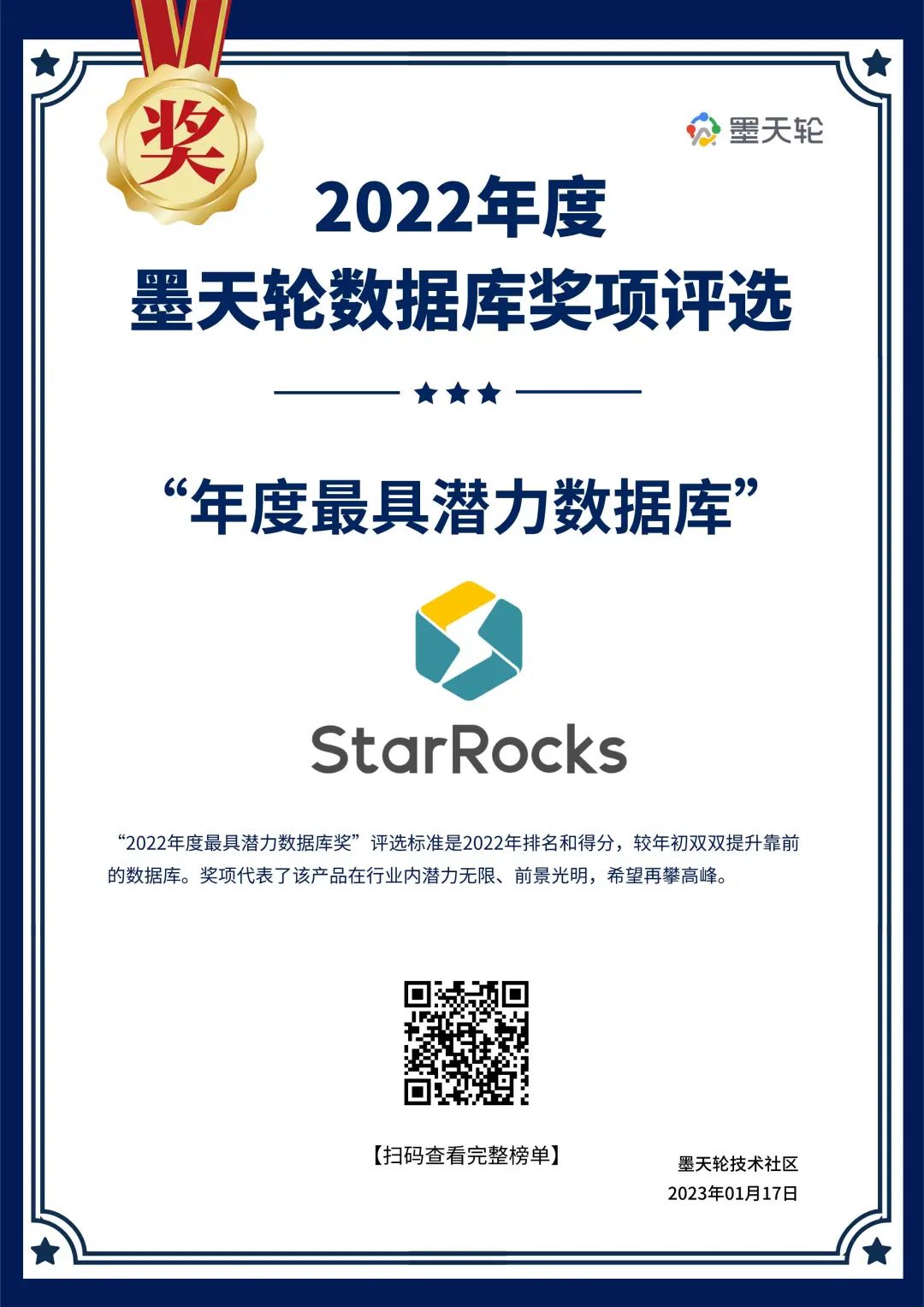 2022年年末,StarRocks的墨天轮排行榜排名为第16位,相较年初提升38位,获得2022年度最具潜力数据库奖。
