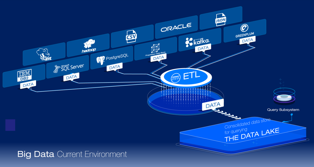 此处展示了一个典型的大数据环境,如图可见有一组快速变化和扩张的、不同类型的数据源,企业要查询和整合所有数据源中的数据,通常采用ETL方式将数据转换为通用格式并转移到可查询的位置,往往会造成“数据湖”的形成,从而导致实现过程具有复杂性、效率低、成本高等弊端。