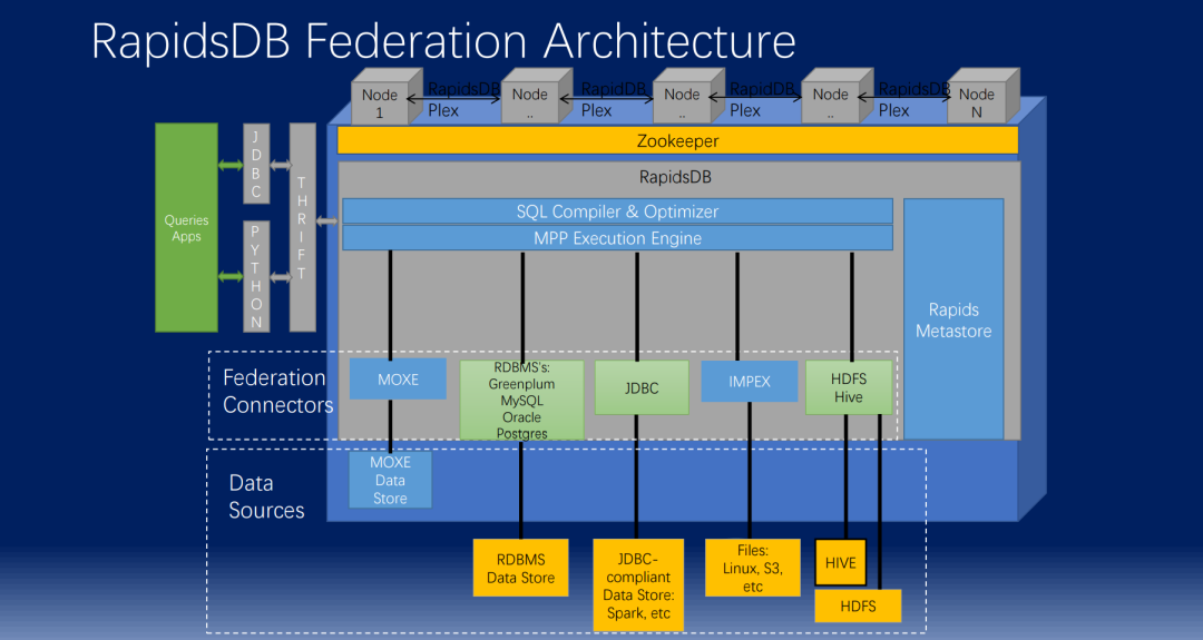 从上图中可以看到,RapidsDB联邦架构为用户提供了一组可以在应用程序中向系统提交查询的接口,它包含: