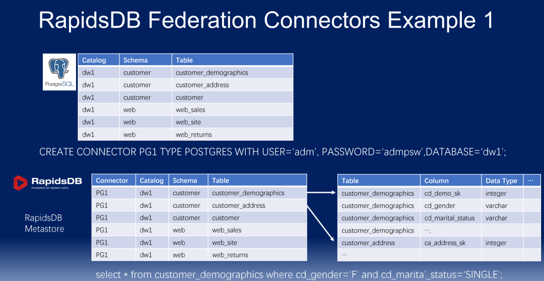 连接器将会查看需要管理的所有表的模式信息,然后把这些信息放入RapidsDB元数据存储仓中。可以看到其中一个重要特性是连接器保留了原始数据库中的模式名、表名以及列名。因此,对于这一特定表的查询其实是在Postgres数据库中运行的,它们都始终保留在原系统中。