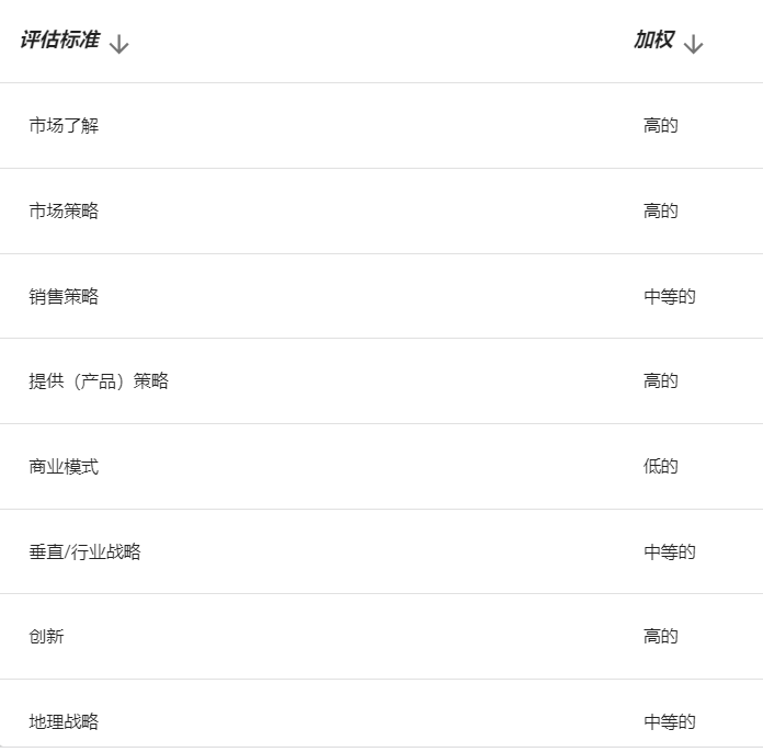销售策略:该标准为直接和间接销售、营销、服务和通信分支机构寻找合理的策略,以扩展组织的影响范围、技能、专业知识、技术、服务和客户群的范围和深度。关键指标是供应商针对内部销售、市场、直接销售、ISV/OEM 销售和 SI 销售的不同方法。
