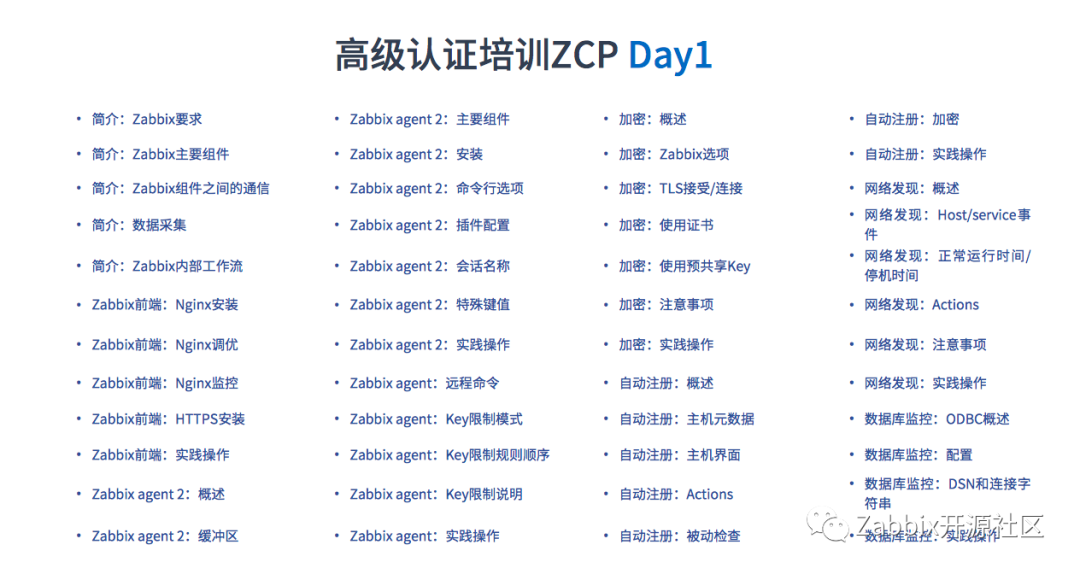 培训内容是Zabbix原厂设计的系统课程,讲师是通过Zabbix培训师考试和课程考试的认证培训师。培训由“理论+实践+咨询”组成,可以就自己公司问题和培训师交流。