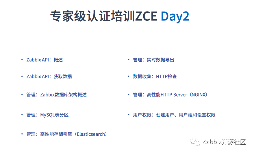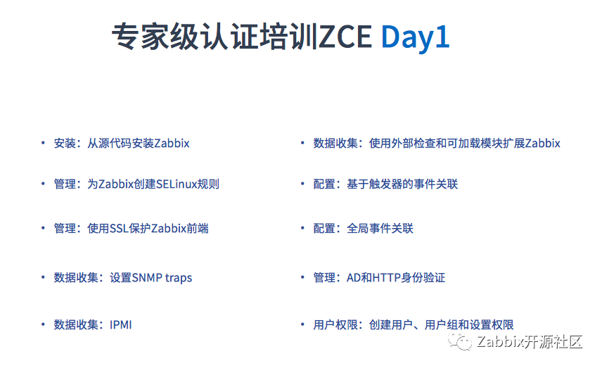 适用于专业使用Zabbix的技术人员,5天的系统性培训全面教授Zabbix的概念和架构知识,确保技术人员无障碍、高效率的使用Zabbix并且为其他用户提供支持。