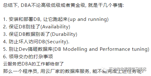 DBA 是很专业的工作,我专职做 DBA 七年有余,一开始只能专注于 MySQL 等开源数据库,这几年才往广度学习,redis、TiDB、PG、openGauss 等等,作者说的普通程序员应该是单纯使用 MySQL 或 PG 云数据库的,这只是众多数据库里的冰山一角。数据库知识很专业,并且数据是企业的核心资产(数据在则企业在,数据亡则企业亡),前段时间新加坡 shopee 裁员时裁了一整个业务线,所有人都被裁了,只留下 DBA SRE 去管理数据。没有人会相信一个业余选手能维护好数据库。作者说了很多云的好处,实际上云的坏处只字不提,已经有其他同学发文章回应了,例如云比 DBA 要贵很多,云有供应商绑定的问题(上云容易下云难),这些我就不提了,相关反驳可以看这篇文章《云数据库是不是智商税?》。一开始以为作者是阿里云 RDS 的营销号,实际上不是,作者只是单纯的无知的认为程序员可以替代 DBA 而已,但他没弄明白 DBA 只是个角色,一个伟大的数学家,可以同时是程序员、甚至厨师,他当然也可以是一名 DBA 了,这没冲突。