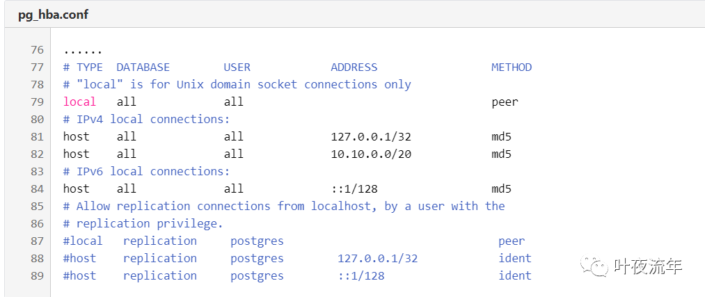 新增 82 行配置,确保从研发网段 10.10.0.0/20 可以使用所有用户以密码认证方式(password 或 md5,前者传递密码明文,后者传递 MD5 摘要,更安全)登录进入所有(all)数据库。同时修改第 81 行和第 84 行,将本地连接的认证方式由 ident 改为 md5,确保本地使用 JDBC 可以通过 localhost 主机连接到数据库。