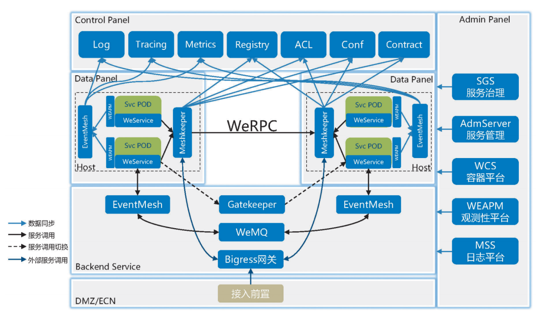 虽然消息总线也能支持Request-reply同步服务调用,但流量治理并非其强项,有了EventMesh的经验,我们把目光投向了ServiceMesh。ServiceMesh是把控制面和数据面进行分离的架构,在解决业务代码发布效率、解耦合、多语言支持方面有很好的收益,但同时带来了架构复杂度的提升、端到端延时的升高等问题,这些问题阻碍着ServiceMesh大规模生产上线。SpringCloud、Dubbo等非常成熟的RPC治理框架仍然是微服务化的主要选择。