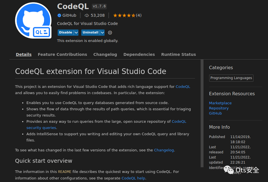 如果 CodeQL 扩展的安装正确完成,您将在某个位置找到 CodeQL CLI 文件,例如$HOME/.config/Code/User/globalStorage/github.vscode-codeql/distribution2/codeql/codeql