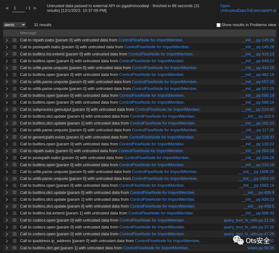 将是一个好的开始。让我们通过打开这个文件来尝试一下,然后简单地点击CodeQL: Run query。这需要一些时间,喝杯咖啡……你回来了吗?让我们看看结果如何。