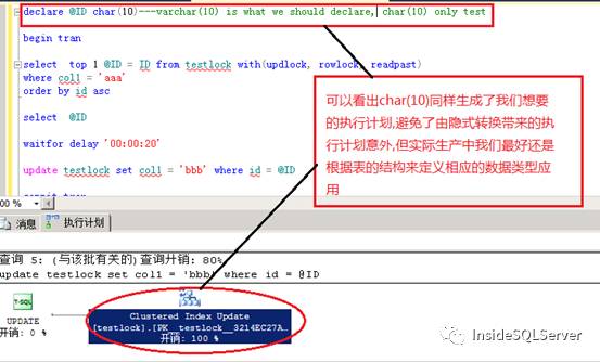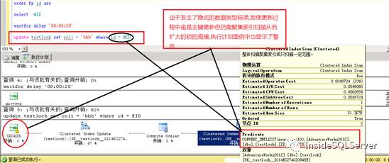 进而分析任意一个会话的执行计划语句发现了异常,最后的更新出现了隐式数据类型转换,以至于做了额外的聚集表扫描过程,致使执行更新过程需要所有键的U锁,从而引发了死锁.