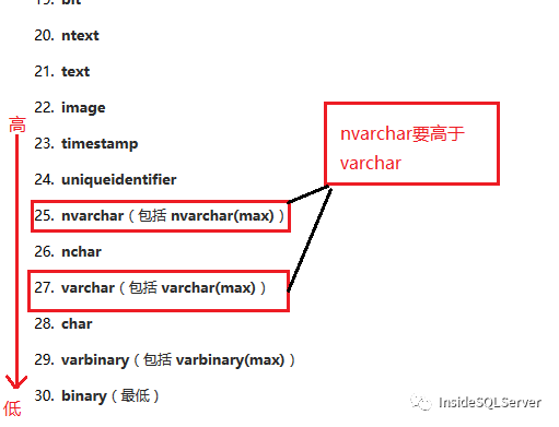 通过数据类型优先级发现nvarchar是高于varchar的,所以varchar将向nvarchar转换,进而使优化器选择了意料之外的执行计划,从而引发了死锁