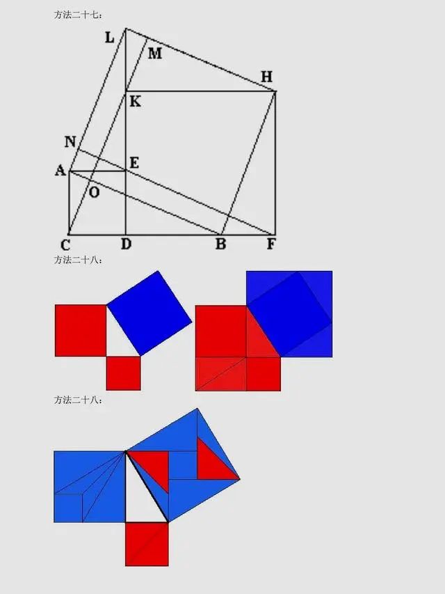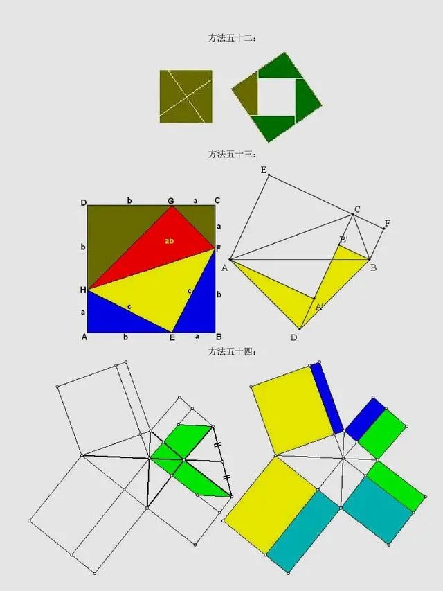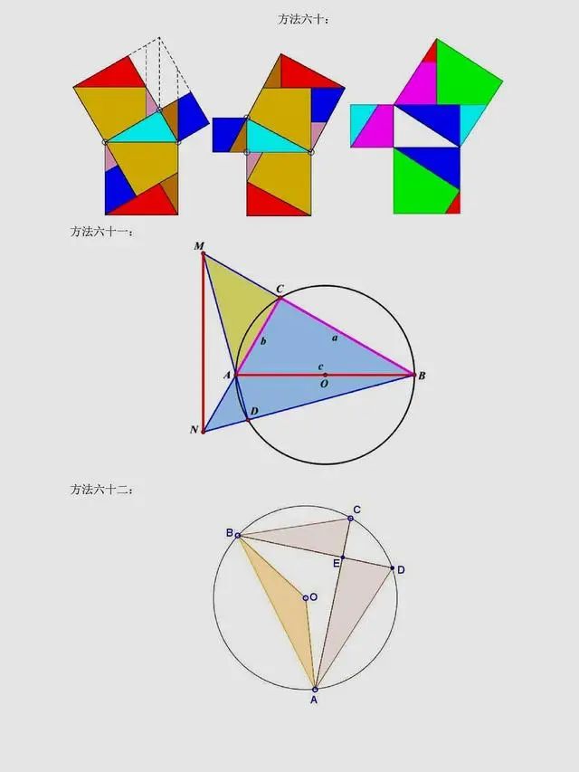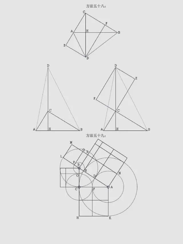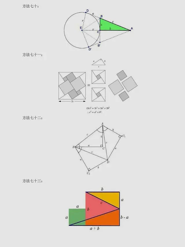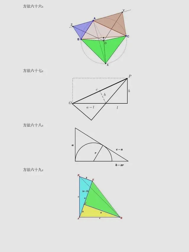 总结:上述方法是非常常见的方法,当然同学们可以总结出,用到最多的还是面积法,对于面积法无论证明方法如何变化,图形如何变化,方法都有一种熟悉感。同时,还有很多其它与圆相关的定理应用,要理解它们,同学们要掌握更多的相关知识。以下方法,只展示图片,同学们可以自行感悟。