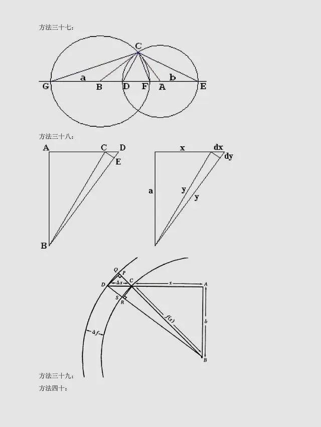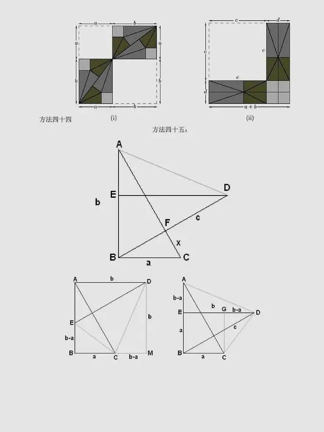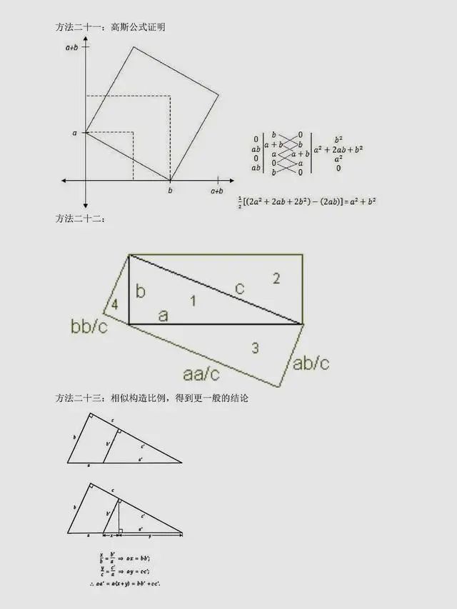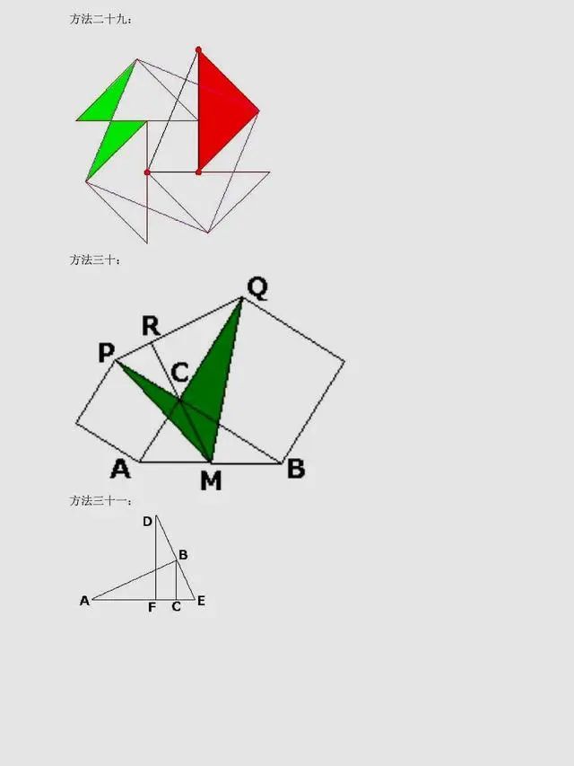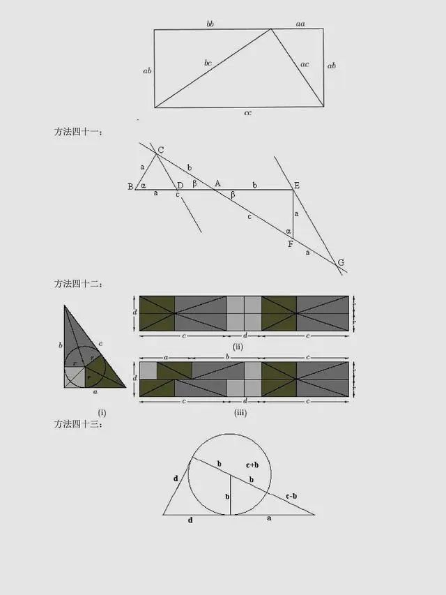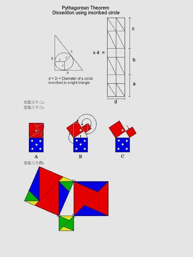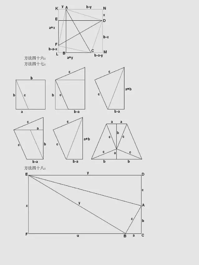 总结:上述方法是非常常见的方法,当然同学们可以总结出,用到最多的还是面积法,对于面积法无论证明方法如何变化,图形如何变化,方法都有一种熟悉感。同时,还有很多其它与圆相关的定理应用,要理解它们,同学们要掌握更多的相关知识。以下方法,只展示图片,同学们可以自行感悟。