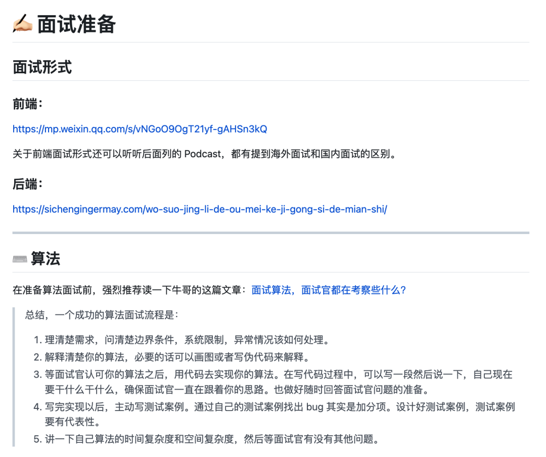 还有如何快速提高自己英文面试水平的方法,内容很多了,我就不一一列举了,大家感兴趣的话,可以去 GitHub 上详细查看。