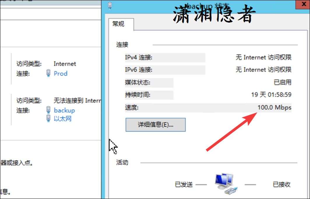 因为DP是将备份备份到虚拟带库,同一网段和区域,不止这一台数据库服务器,对比发现只有这一台数据库的备份时间变长,备份变慢。经过和系统管理员的沟通排查后排除是存储IO性能问题。接下来最可疑的就是网络带宽问题了,我之前工作中也遇到过网络带宽引起备份作业变慢的案例:Symantec Backup Exec服务器的网卡从千兆速率变成了百兆速率,引起Symantec Backup Exec的所有作业变慢,备份时间大幅拉长的情况。登录Windows服务器检查服务器的网卡(双网卡),检查发现备份使用的网卡(backup)速率是百兆速率。如下截图所示: