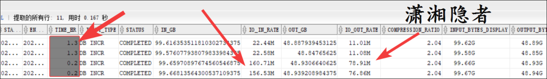 排除了上面两大类因素后,那么导致RMAN备份作业变慢的可能因素只能是硬件资源问题了,我们使用下面脚本查询RMAN备份记录信息,发现备份文件的大小并没有增长,其实也侧面验证数据库大小没有变化,归档日志没有暴增。其实排查的步骤应该先通过这个脚本查看备份文件大小是否有较大变化,如果OUT_GB没有太大变化,可以直接跳过备份数据量增长因素,直接排查其他原因,如果备份数据量(OUT_DB字段值)有较大波动,那么就可以按上面步骤进行排查;检查数据过程中,发现IO_IN_RATE和IO_OUT_RATE这个字段的数据在问题出现前后出现很大幅度的变化,这两个指标出现问题,不一定就意味着存储IO出现了性能问题,只能说存储设备出现IO性能的可能性非常大。也有可能由网络带宽导致。