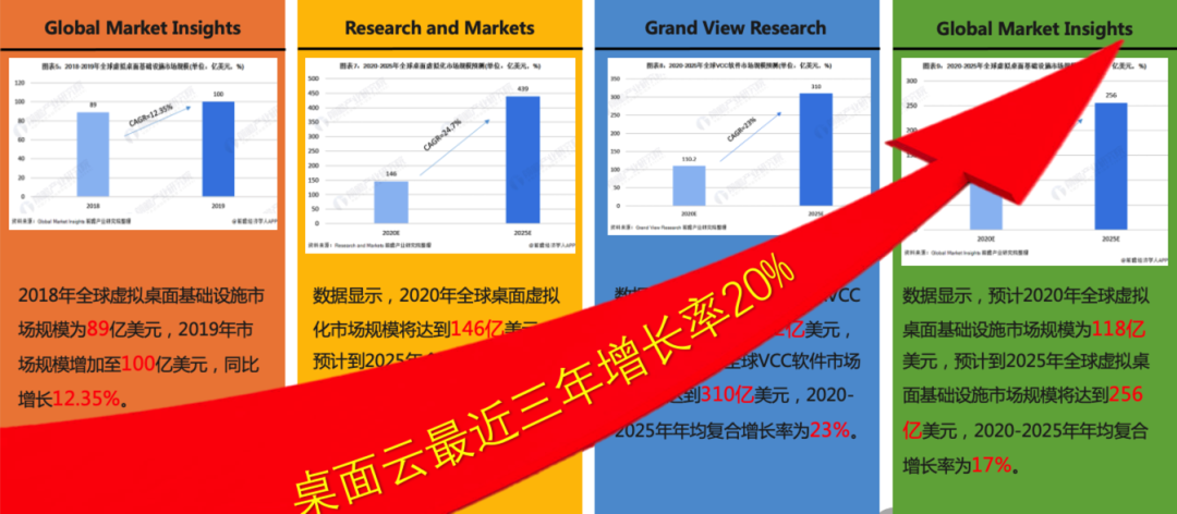 根据权威机构数据,桌面云最近3年增长率达20%,市场规模百亿美金,中国本土IT基础设施完备,也有20亿元的市场空间。