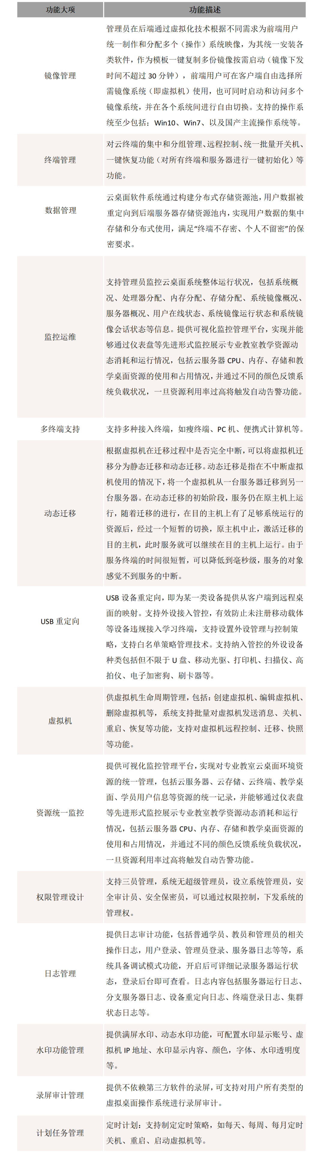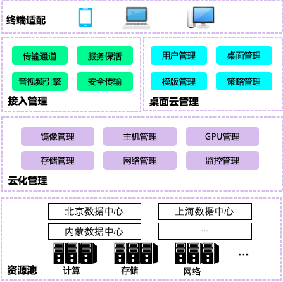 •桌面云管理:桌面云管理后台,提供用户管理和桌面管理,分配资源;提供策略管理,为终端用户配置不同的访问策略