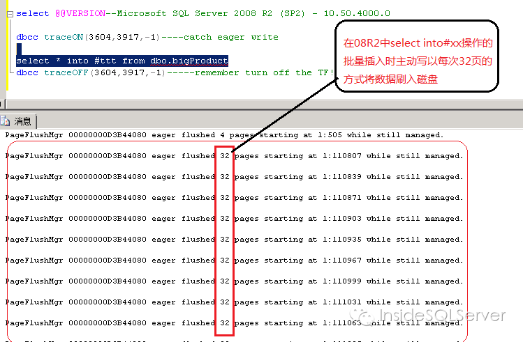 主动写:Sql server引擎在面对最小化日志操作的情形时(blukinsert,select into,etc)会采用主动写的方式将数据页批量刷入(一般32页/次)磁盘,以减小惰性写(lazy