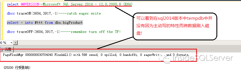 通过实例我们可以看到在sql2014中,tempdb中的操作并没有因为select into而触发主动写,使得磁盘操作得以避免.