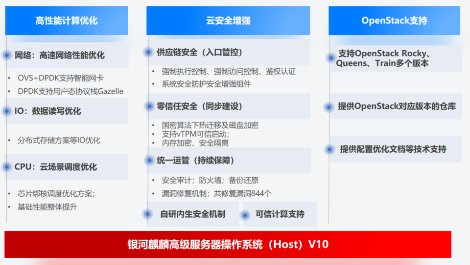 在国产创新的专有云场景下,企业不仅对高性能云计算的算力服务需求紧密,同时对安全性亦有更高要求标准。银河麒麟高级服务器操作系统(Host)V10 对高性能计算技术支撑和云安全双管齐下、交叉赋能加速融合,能够安全高效能的支持运行于专有云平台上的核心业务。