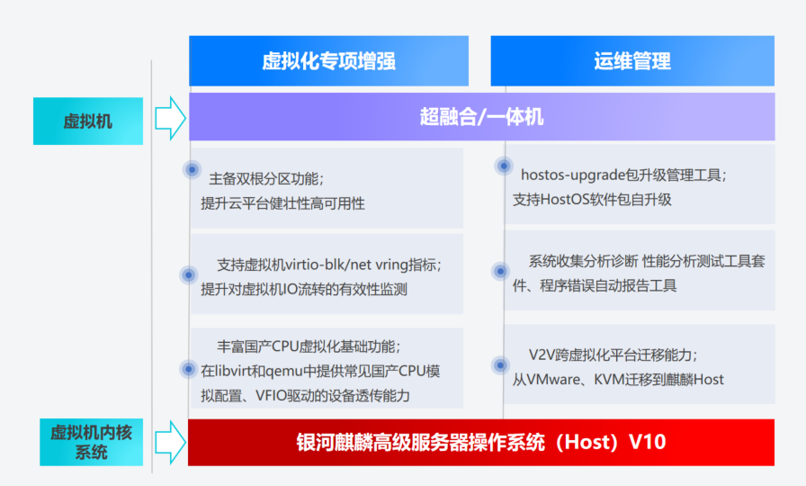 超融合技术方案是对虚拟化技术的拓展应用,也是常见的由传统集中式架构向分布式架构的转型升级的云数据中心方案。银河麒麟高级服务器操作系统(Host)V10通过虚拟机内部的可观测性,可实现虚拟机跨平台迁移。