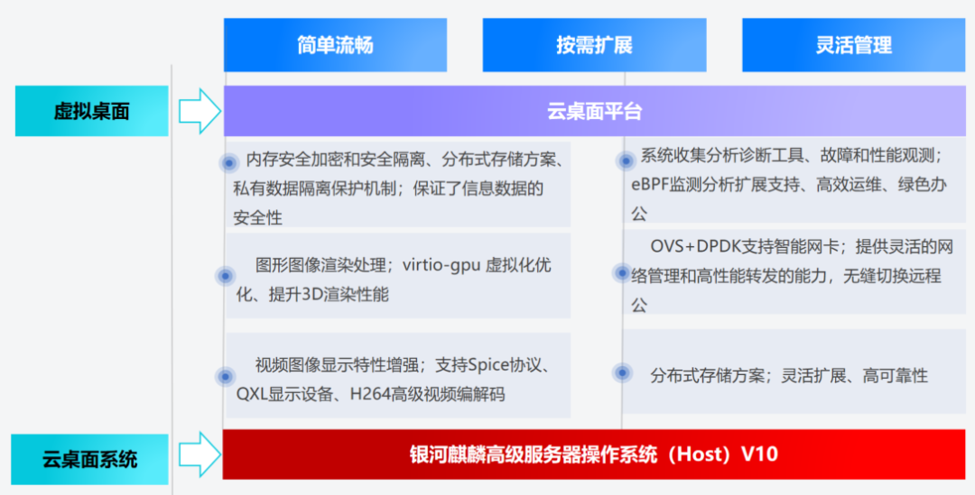 在传统IT架构下,桌面终端的集中管理、统一运维、数据安防存在局限性。云桌面伴随着信息化时代的网络质量和数据高速增长而快速发展,在保障业务连续性、兼容性、数据安全、移动办公、资源利旧方面优势明显,也是云类厂商提供常见的应用方案之一。银河麒麟高级服务器操作系统(Host)V10采用图形图像渲染处理等云桌面技术,针对virtio-GPU显卡进行虚拟化优化,精简渲染命令处理过程中冗余函数调用,缩短各渲染命令的处理时间,大幅提升3D渲染性能。