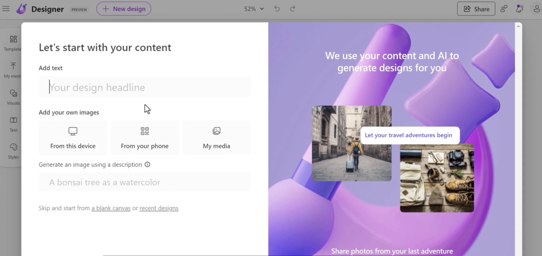 以 Designer 应用程序为例,用户通过 designer.microsoft.com 进入Designer 预览界面,体验如何用自然语言生成图像。