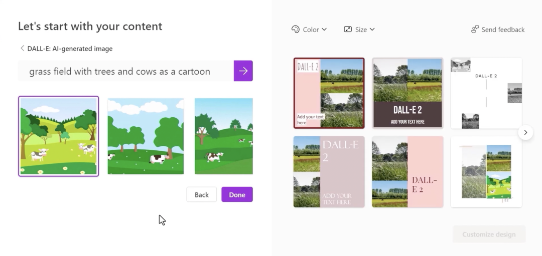 输入“有树木的草地”、“牛”、“动画形式”、“放大到屏幕中央”等 文本「提示」,Designer 即可解读输入的内容,并在每次迭代的时候创建出新的图像。