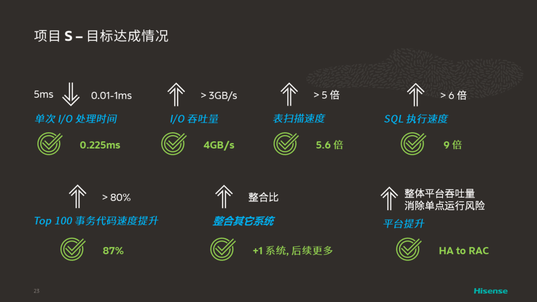 海信的案例非常具有代表性,因为其中包括了两个场景。第一个场景(项目H)通过Database In-Memory实现了大幅性能提升,应用无需改动,现有的小型机硬件也继续沿用。第二个场景(项目S)通过Database In-Memory和Exadata实现了整体数据库平台的提升,包括性能,可用性,安全性和可管理性。