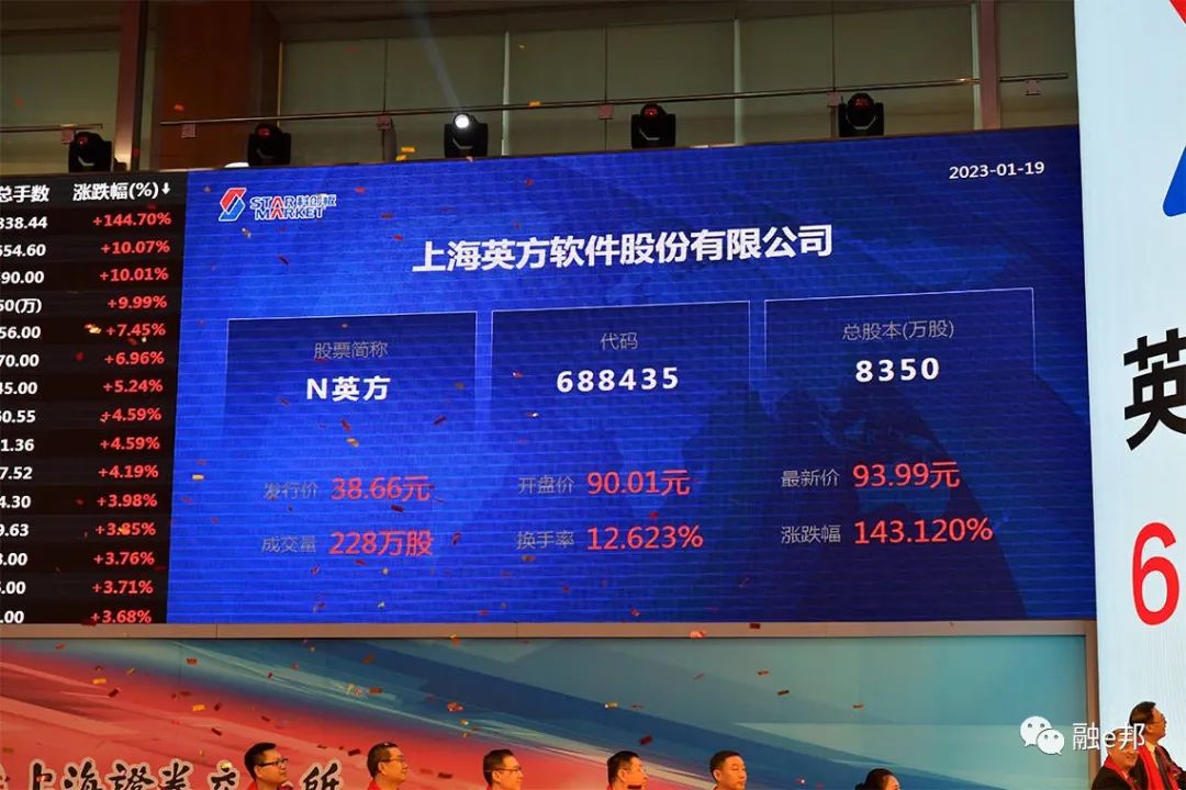 牵手融e邦,资本运作很简单。1月19日讯 今日,上海英方软件股份有限公司(简称“英方软件”,688435.SH)在上交所科创板上市。截至收盘,英方软件报107.00元,涨幅176.77%,振幅72.94%,成交额13.70亿元,换手率77.85%,总市值89.35亿元。