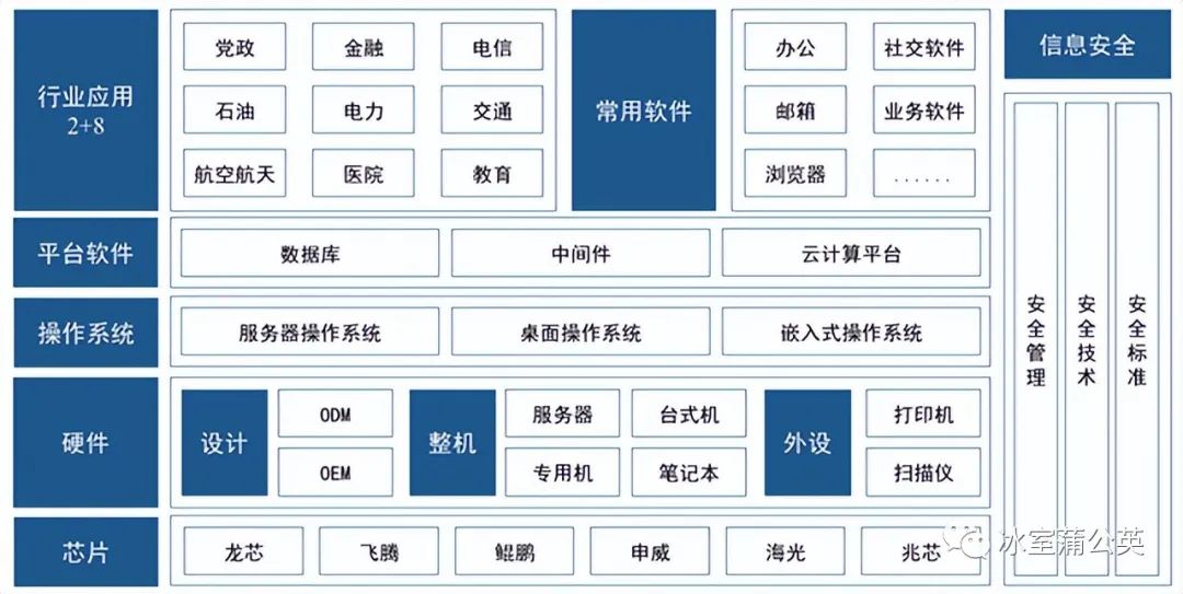 从产业链的角度出发,虽说信创产业的各大分支体系较为庞杂,但主要仍由基础硬件、基础软件、应用软件、信息安全四部分组成。