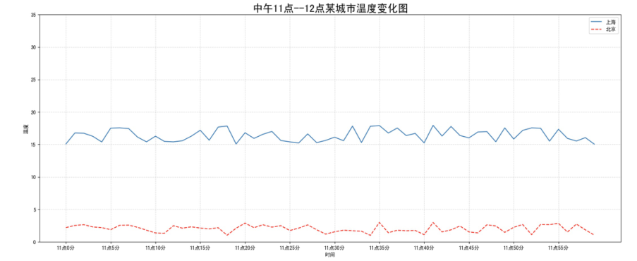 收集到北京当天温度变化情况,温度在1度到3度。怎么去添加另一个在同一坐标系当中的不同图形,其实很简单只需要再次plot即可,但是需要区分线条,如下显示: