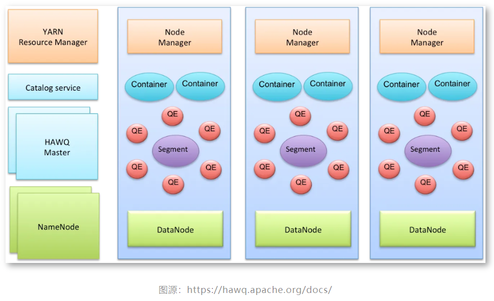 存储由Hadoop HDFS提供服务,绝大多数情况下Segment服务器将使用本地HDFS DataNode服务实现数据存取。集群的计算资源由Master端的资源管理器统一调度,并以资源容器的形式在Segment端体现。
