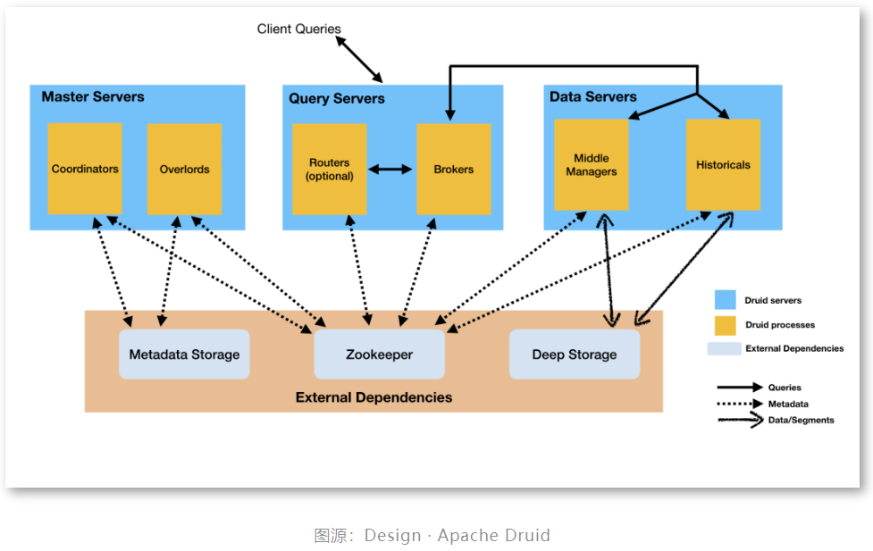Druid 服务可以按照用户需求随意部署,但是为了便于部署, 一般建议按照上图来部署, 分成几种服务器类型: Master, Query, Data。