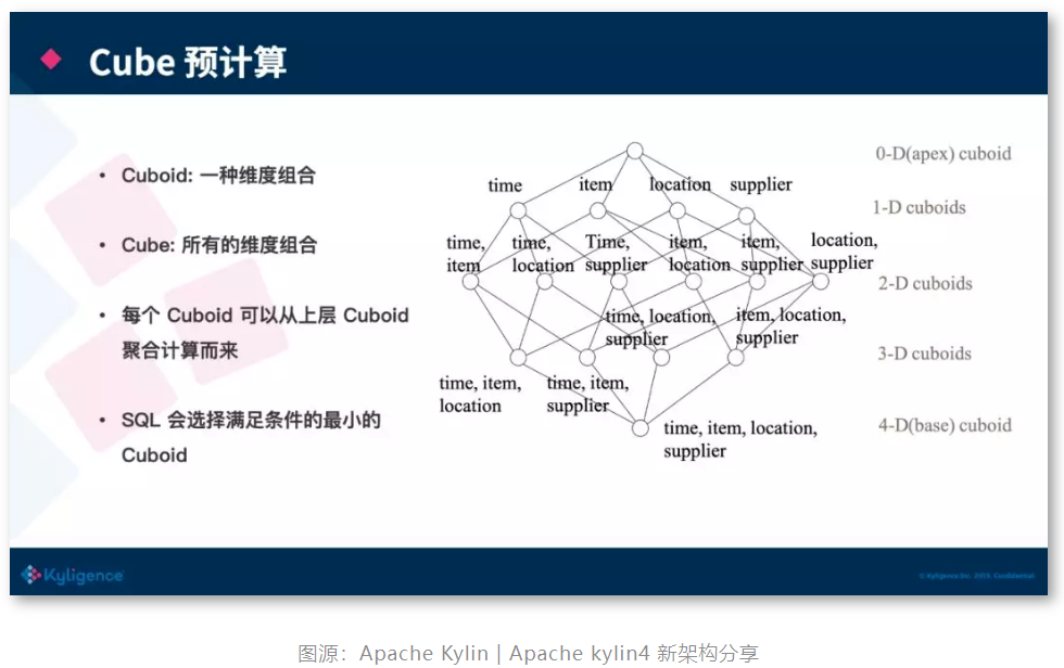 Kylin 的理论基础是 Cube 理论,每一种维度组合称之为 Cuboid,所有 Cuboid 的集合是 Cube。其中由所有维度组成的 Cuboid 称为 Base Cuboid,图中(time,item,location,supplier)即为 Base Cuboid,所有的 Cuboid 都可以基于 Base Cuboid 计算出来。Cuboid 我们可以理解为就是一张预计算过后的大宽表,在查询时,Kylin 会自动选择满足条件的最合适的 Cuboid来进行加速。