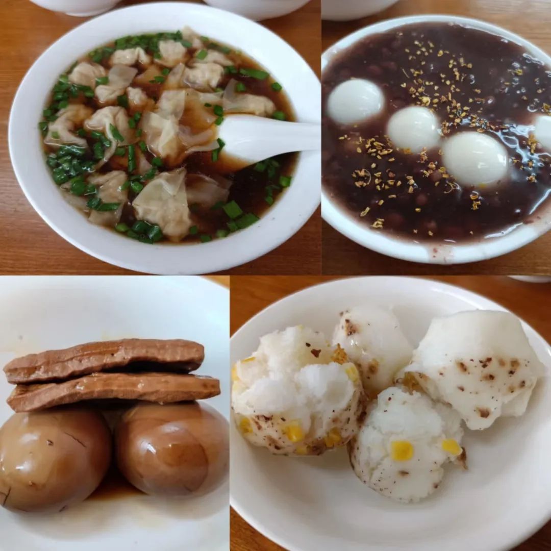 点了桂花赤豆糊,红汤小馄饨,米糕,茶干和茶叶蛋,我对美食没有太多研究,全凭自己感觉,桂花赤豆糊、红汤小馄饨和米糕很好吃,尤其是桂花赤豆糊同样得到了老婆的好评,不是很甜,红豆很糯,口感很好,其他两个就正常味道了