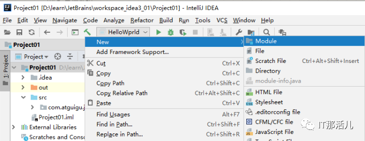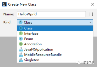不管是创建 Class,还是 Interface,还是 Annotation,都是选择 New --> Java Class,然后在 Kind 下拉框中选择创建的结构的类型。接着在类 HelloWorld 里声明主方法,输出 Hello World!,完成测试。