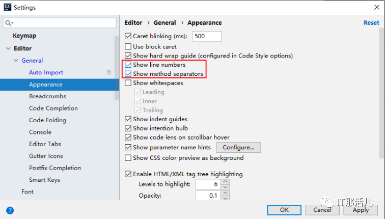如上图红圈所示,可以勾选 Show line numbers:显示行数。新版本idea默认已经勾选。