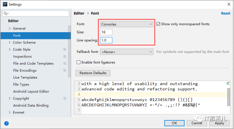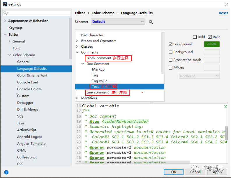 Doc Comment –> Text:修改文档注释的字体颜色。 Block comment:修改多行注释的字体颜色。 Line comment:修改当行注释的字体颜色。