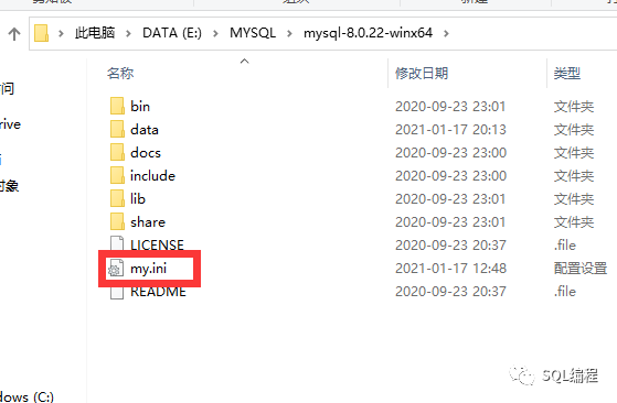 4、替换掉配置文件中的两处目录即可,即 datadir和 basedir 中的E:\MYSQL\mysql-8.0.22-winx64 文件目录,替换成你的sql安装目录即可
