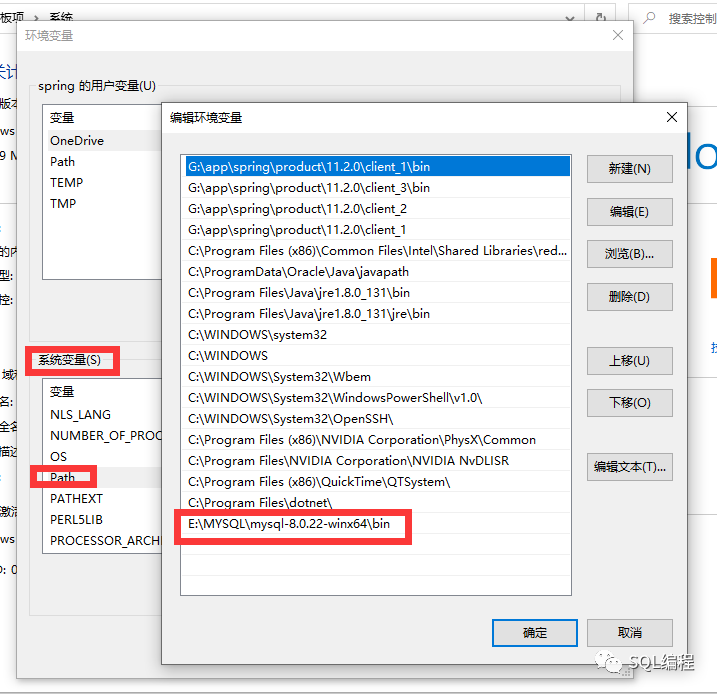 5、添加mysql环境变量,在系统变量的path(环境变量里面)加上mysql路径(\bin),我是win10系统,win7系统请百度