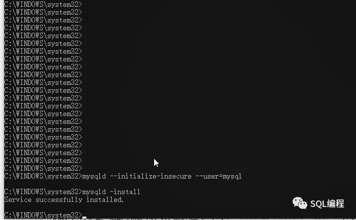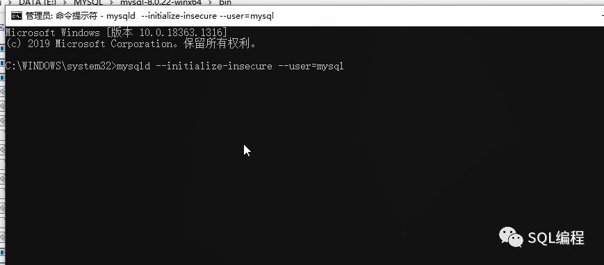 6、以管理员身份打开命令提示符(cmd),输入初始化命令 mysqld --initialize-insecure --user=mysql ,等待一会儿