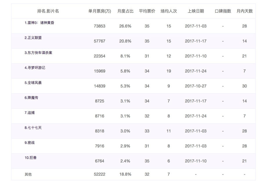 movie_name = ['雷神3:诸神黄昏','正义联盟','东方快车谋杀案','寻梦环游记','全球风暴','降魔传','追捕','七十七天','密战','狂兽','其它']