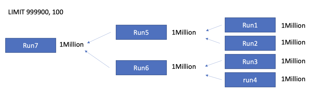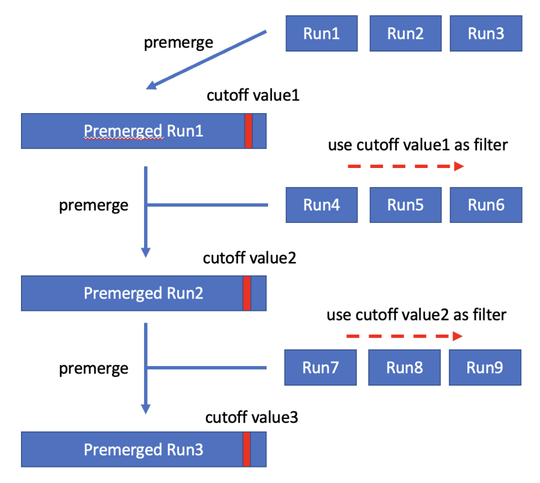 如果TopK查询中K大于单个sorted run的长度,该方案会积累足够的sorted run(包含的记录数量大于K),然后对这些sorted run提前进行merge,从而获得cutoff value。接下来会使用cutoff value进行过滤并继续积累足够的sorted run,从而获得更小的cutoff value,依此类推。整个执行过程和K小于单个sorted run的情况是类似的,区别在于需要merge足够的sorted run才能获得cutoff value。