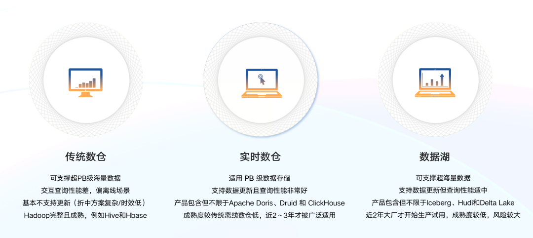 我们对传统数仓、 实时数仓和数据湖进行了对比。从上图可知,传统数仓可以支撑超 PB 级的海量数据,但是交互查询性能相对差一些,偏离线场景,不满足我们对数据实时性的要求;数据湖可以支撑超海量的数据,支持数据更新,查询性能适中,但是数据湖近两年才开始应用,成熟度较低,使用风险较大;实时数仓适用 PB 级数据存储,支持数据更新且查询性能非常好。结合我们的要求,实时数仓与我们的使用和需求场景都比较贴合,因此我们最终决定选择实时数仓作为数据底座。