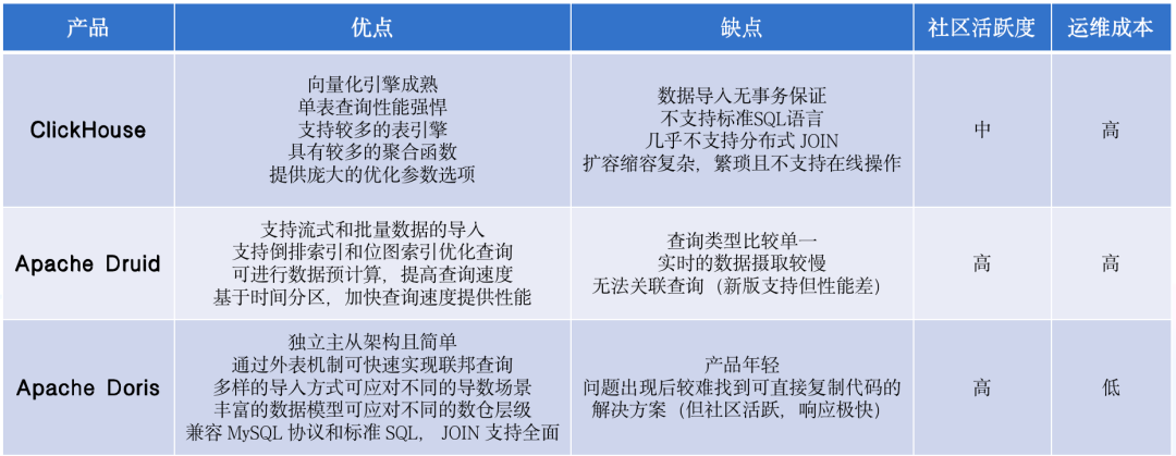 对比可知,Apache Doris 优势明显、性价比更高,具有独立主从架构简单、运维更灵活便捷、丰富的数据模型、优秀的查询性能和周全的生态规划等诸多优势,对比这三个产品,Apache Doris 最符合我们的选型要求。