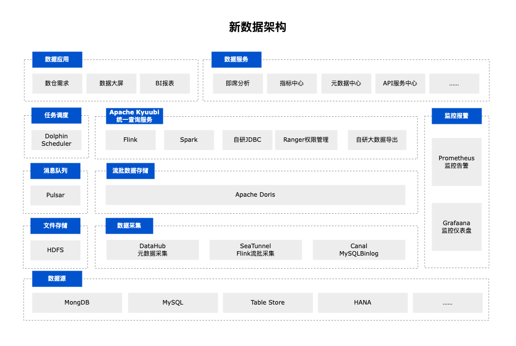 新数据架构基于 Apache Doris 简化了数据采集、存储和计算的流程:
